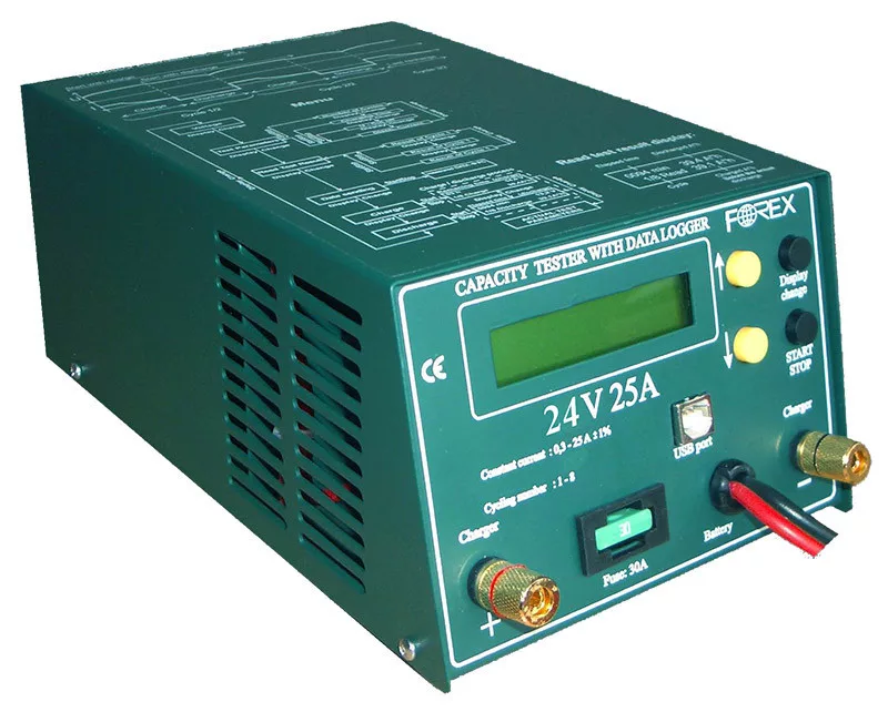 Akkumulátor teszter, amely alkalmas 24V-os akkumulátor felügyelet nélküli tesztelésére, kapacitásmérésre, kiegészítõ eszközökkel (akkumulátor töltõ, elektronikus szulfátmentesítõ) akkumulátor regenerálásra. A mért adatokat a mérés után USB vonalon PC-be áttöltheti, tanulmányozhatja, és jegyzõkönyv formában kinyomtathatja. , Alkalmazható bármilyen 24V-os ólom-savas akkumulátor energiatárolásának mérésére. ,- Stabilizált, feszültségtõl független kisütõ áram 0,3A-tól 25A-ig ,- Programozható végfeszültség ,- A mérési részadatok mérés közben is kiolvashatók, számítógépen grafikon formájában megjeleníthetők ,- Megbízható hõvédelem a túlmelegedés ellen ,- Túlfeszültség védelem ,- USB csatlakozási lehetõség , Műszaki adatok , , Mérhető akkumulátor: ,0,3Ah -25Ah / 0,1Ah lépésekben , , 10Ah – 200Ah/1Ah lépésekben , ,Kisütési végfeszültség: ,12-30V / 0,6V lépésekben , ,Töltési idõ: ,1-99 óra / 1 órás lépésekben , ,Feszültségmérés: ,12-36V / ±0,2V , ,Méretei: ,145 x 100 x 220 mm , ,Üzemi hõfok: ,0-40°C , ,Külsõ töltõ feszültsége minimum: ,17V , , Használati utasítás (pdf) ,Forex akkuteszter software letöltés