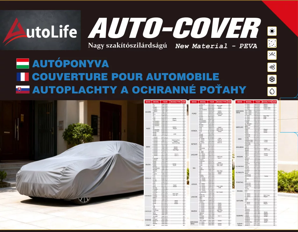 A ponyva 140 × 96 cm méretű, ami a legtöbb kisebb és közepes méretű személyautó szélvédőjére megfelelő. Az egyszerű rögzítésről két praktikus fül gondoskodik, melyeket az ajtók becsukásával lehet rögzíteni, így a ponyva stabilan a helyén marad – még enyhébb szélben is.