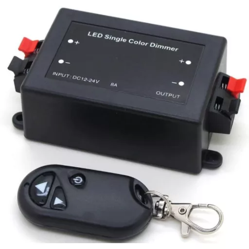 433 MHz-en működő, távirányítóval ellátott, vezeték nélküli LED fényerőszabályozó modul. Nagyon jó minőségű vezérlő, amely lehetővé teszi az egyszínű LED szalagok fényerejének fokozatmentes beállítását. Memóriával rendelkezik az utolsó beállításokról - még áramszünet után is, így a fali főkapcsoló mögé is elhelyezhetjük, mint kiegészítő vezeték nélküli vezérlőelemet. A távirányítóval lehetőségünk van a fényerő beállítására és a ledek teljes kikapcsolására. A rádiós távirányító előnye, hogy a fényerőszabályzót elrejthetjük egy szekrénybe, vagy beépíthetjük a mennyezetbe.