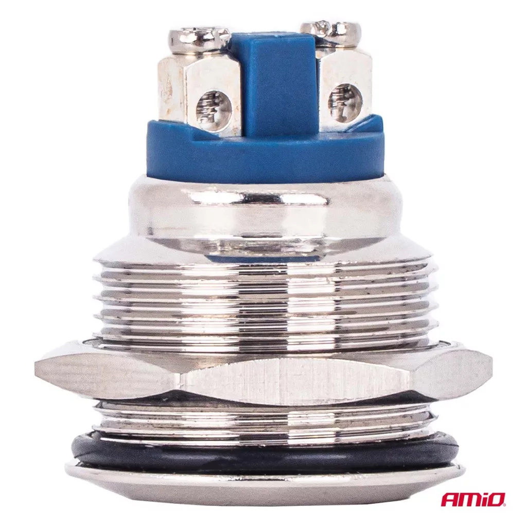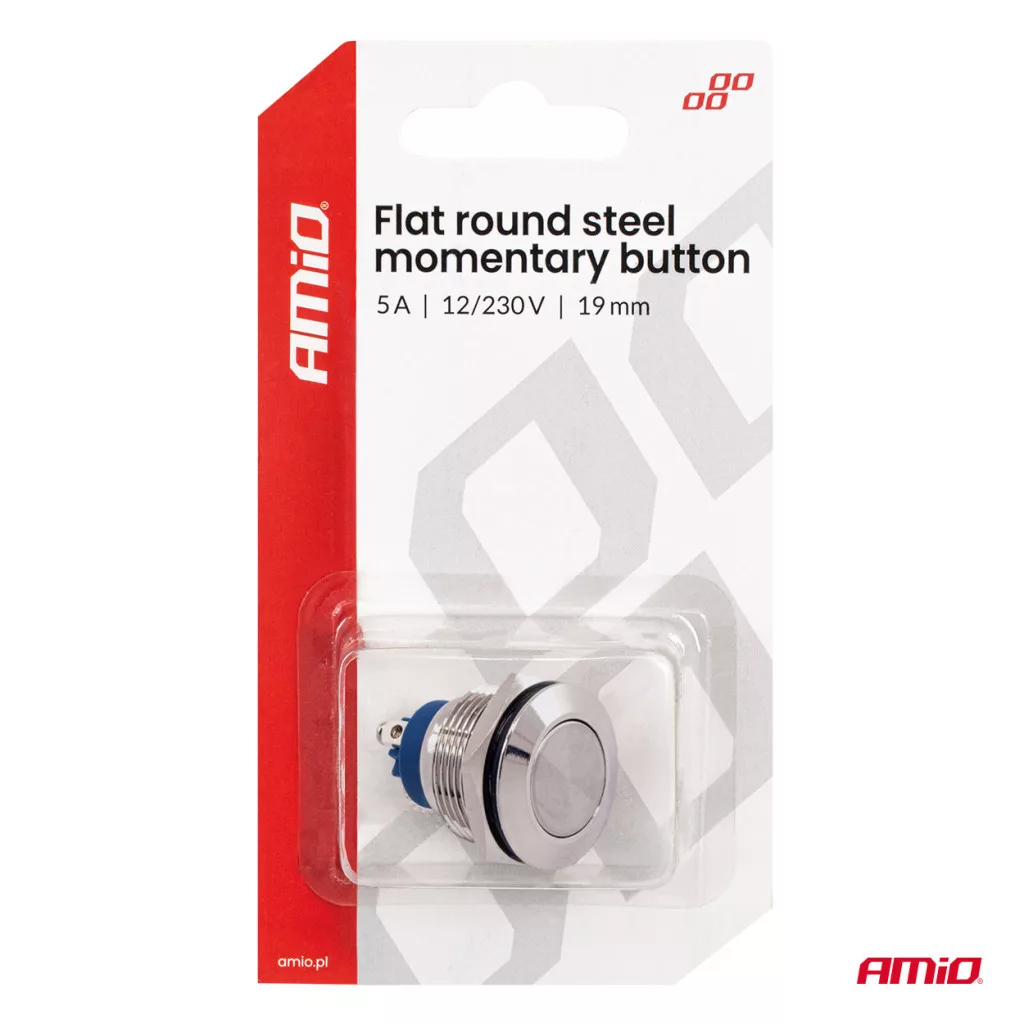 Professzionális, 19 mm átmérőjű, acélból készült, pillanatnyi lapos nyomógomb, 12/230 V-os áramkörök vezérlésére tervezve.
