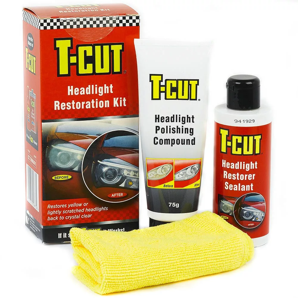 A T-Cut fényszóró-helyreállító készlet visszaállítja a sárga vagy enyhén karcos fényszórókat kristálytisztára.