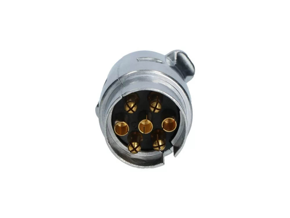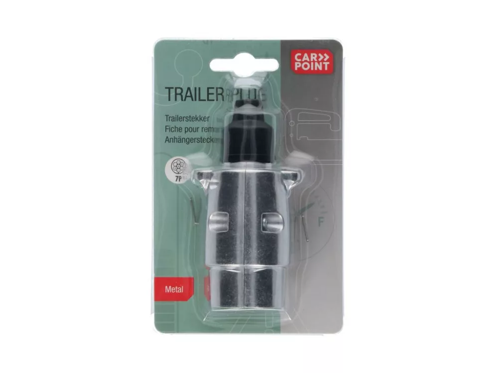 Carpoint 7 pólusú fém csatlakozódugó kerékpártartóhoz, lakókocsihoz vagy utánfutóhoz. Féklámpák, rendszámtábla lámpák, villogó lámpák és hátsó lámpák csatlakoztatásához. Csavaros csatlakozással és gumihüvellyel a kábelbevezetéshez.