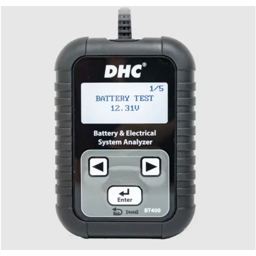 12 V-os akkumulátorok és 12 és 24 V-os indító- és töltőrendszerek tesztelésére. ,Beállítható tartományok: ,EN: 40~2000A ,SAE: 40~2000A ,IEC: 30~1320A ,DIN: 25~1120A ,Feszültségtartomány: 8 - 31,5V ,A BT400 egy kompakt akkumulátor- és elektromos rendszer tesztelő, amely hordozható, ugyanakkor pontos teszteredményeket nyújt. ,Jellemzők: ,Akkumulátor-, indító- és töltőrendszer-tesztelés. ,12V-os akkumulátorteszt / 12V START-STOP akkumulátorteszt / 12V és 24V-os indító/töltőrendszer teszt / belső ellenállás teszt ,LCD állítható fényerővel ,4 soros LCD kijelző, állítható fényerővel. ,Járműteszt ,Az akkumulátortesztet és a rendszertesztet egyetlen feladatban egyesíti, teljes teszteredményt biztosítva. ,Hőmérséklet kompenzáció ,Különböző hőmérséklet-kompenzáció 0ºC (32ºF) felett/alatt. ,Kompakt kialakítás ,A kompakt kialakítás nagy mobilitást biztosít, ha helyszíni tesztre van szükség. ,Visszalépés funkció gomb ,Rossz beállítást választott? Tartsa lenyomva az Enter billentyűt, és térjen vissza az előző szakaszhoz ,10 elérhető nyelv ,Angol, francia, spanyol, német, olasz, portugál, holland, orosz, török, cseh nyelven érkezik , Felhasználói kézikönyv ,
