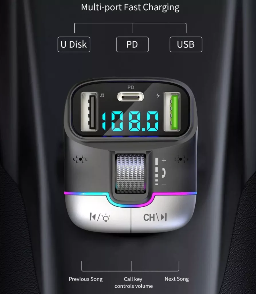 FM modulátor GZ01, Axroad Mall, Bluetooth 5.3, FM adó töltéssel, 2 x USB port, USB Type-C port, USB stick port, gyorstöltés, bármilyen eszközzel kompatibilis, LED kijelző, akkumulátor kijelző, fekete