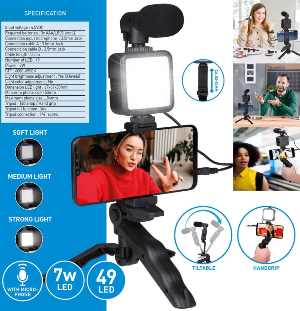 Alakítsa át tartalomkészítési élményét a Grundig 3 az 1-ben szelfi stúdió blogkészlettel, amelyet a beépített világítással, mikrofonnal és állvánnyal úgy alakítottak ki, hogy magasabb szintre emelje felvételeit. A vloggereket, tartalomkészítőket és élő közvetítőket kiszolgáló sokoldalú készlet 49 LED-es lámpával büszkélkedhet, állítható fényerő-beállításokkal, biztosítva a videók optimális megvilágítását a fényviszonyoktól függetlenül. A mellékelt külső mikrofon tiszta hangzást biztosít, gazdagítja a felvételek minőségét és kiemeli a tartalmat. A mozgásban lévő alkotók számára tervezett Grundig Vlogging Kit ötvözi a kompaktságot a hordozhatósággal, rugalmas megoldást kínálva a tartalom rögzítésére bármikor, bárhol. Az állvány dönthető funkciója és a különböző méretű okostelefonokkal való kompatibilitás garantálja a stabilitást és az alkalmazkodóképességet a felvételek során. Akár sminkelési oktatóanyagokat forgat, akár virtuális értekezleteket szervez, akár napi vlogokat dokumentál, ez a készlet mindent biztosít, amire szüksége van a professzionális szintű tartalom könnyed előállításához. A Grundig Vlogging Kit műszaki specifikációi közé tartozik a robusztus műanyag konstrukció, a 4,5 VDC bemeneti feszültség és a 3 x AAA/LR03 akkumulátorral való kompatibilitás. A 3,5 mm-es jack csatlakozókkal ellátott csatlakozókábelek biztosítják az okostelefonokkal való zökkenőmentes integrációt. A LED-es lámpák 6000K és 6500K között állítható színhőmérsékletet kínálnak, testreszabható világítási lehetőségeket biztosítva az Ön preferenciáihoz és a felvételi körülményekhez igazítva. Ezenkívül az állvány 1/4 hüvelykes csavaros csatlakozással büszkélkedhet a problémamentes rögzítés érdekében, és tartalmaz egy mikrofont a videók eredeti hangrögzítéséhez. Jellemzők: Sokoldalú vlogging készlet: A Grundig 3 az 1-ben szelfi stúdió vlogging készlet átfogó megoldást kínál a tartalomkészítők számára, beépített világítással, mikrofonnal és állvánnyal az all-in-one kényelem érdekében. Állítható LED-világítás: A 49 egyedi LED-lámpával és az állítható fényerő-beállításokkal ez a vlogging készlet optimális megvilágítást biztosít videóihoz, lehetővé téve tiszta és élénk felvételek rögzítését bármilyen megvilágítási környezetben. Kiváló minőségű hangfelvétel: A külső mikrofonnal felszerelt Grundig Vlogging Kit javítja a hangminőséget, lehetővé téve tiszta és pontos hang rögzítését a videotartalom kiegészítéseként. Okostelefon-kompatibilitás: Ez a vlogging készlet kompatibilis az okostelefonok méretének széles skálájával, 53 mm-től 84 mm széles eszközökig, biztosítva a stabilitást és a sokoldalúságot a felvételi munkamenetek során. Hordozható és könnyű: Az úton lévő alkotók számára tervezett Grundig Vlogging Kit kompakt és könnyű, így könnyen hordozható és beállítható a munkamenetek rögzítéséhez, bárhová is megy. Dönthető állvány kialakítása: A készletben található állvány dönthető funkcióval rendelkezik, amely lehetővé teszi az okostelefon szögének beállítását a tartalom tökéletes perspektívából történő rögzítéséhez. Egyszerű beállítás: Az egyszerű és intuitív beállítási eljárásokkal ez a vlogging készlet felhasználóbarát, és minimális erőfeszítést igényel az összeszerelése és használata, lehetővé téve, hogy technikai gond nélkül összpontosítson a tartalom létrehozására. Tartós konstrukció: Kiváló minőségű anyagokból, többek között tartós műanyagból és korrózióálló fém alkatrészekből készült, ez a vlogolókészlet tartós és ellenáll a rendszeres használat megpróbáltatásainak. Állítható színhőmérséklet: A LED-es lámpák 6000K és 6500K között állítható színhőmérséklet-beállításokat kínálnak, így rugalmasan testreszabhatja a világítást az Ön preferenciái és a felvételi körülmények szerint. Teljes csomag: A Grundig Vlogging Kit mindent tartalmaz, amire szüksége van a professzionális minőségű videók készítéséhez, beleértve az állványt, a mikrofont és az integrált LED-világítást, amely átfogó megoldást kínál minden szintű tartalomkészítő számára. Műszaki adatok: Márkanév: Grundig Szín: Fekete Felépítés: ABS Bemeneti feszültség: 4.5VDC Elem: 3 x AAA/LR03 (külső) Csatlakozó kábelek A/B: 3,5 mm-es jack csatlakozók Kábelhossz: 50 cm LED lámpák száma: 49 Teljesítmény: 7W Színhőmérséklet: 6000-6500K Állítható fényerő: Igen, 3 beállítás LED-lámpa méretei: 67 x 67 x 30 mm Minimális telefonméret: 53 mm Maximális telefonméret: 84 mm Állvány típusa: Asztali állvány dönthető funkcióval Állvány csatlakozása: 1/4" csavar Mikrofonnal