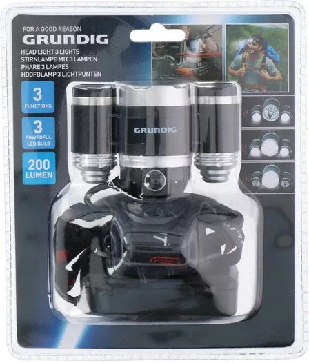 Ez a Grundig fejlámpa kényelmes fejpánttal rendelkezik. A lámpa 3 nagy teljesítményű LED lámpával rendelkezik, és szuperfényes fehér fényt ad 200 lumen fényerővel. Kiválaszthatja, hogy mind a 3 lámpát egyszerre szeretné égni, csak a főlámpát vagy csak a két oldalsó lámpát. A lámpa 4 db AA elemmel működik (nem tartozék).