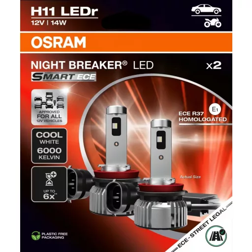Az OSRAM új NIGHT BREAKER LED SMART ECE H11 teljes mértékben homologizált az ECE R37 szerint, és ennek megfelelően minden 12 V-os járműhöz jóváhagyva minden ECE-tagországban, minden világítási funkcióra, mint minden H11 lámpa és H11 foglalatú cserére.