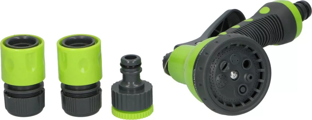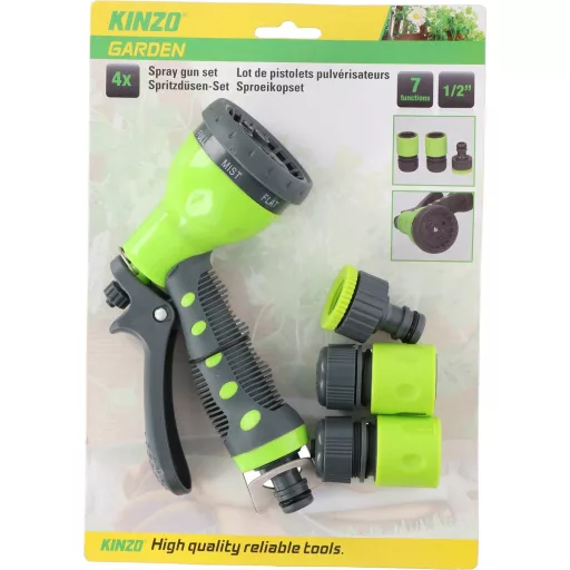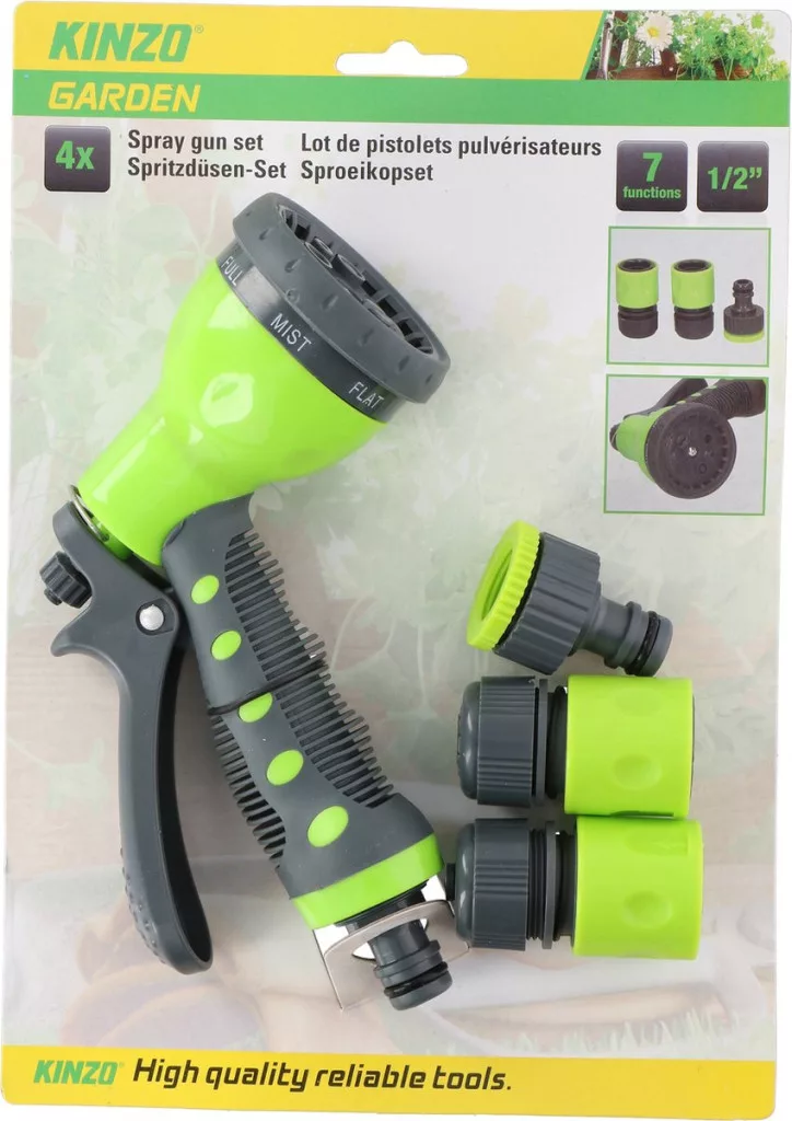 A növények öntözése mostantól egyszerű ezzel a 4 darabos Kinzo Garden locsolófúvóka-készlettel. A készlet tartalmaz egy 7 funkciós locsolófejet, 2 csatlakozót a kerti tömlőhöz és 1 csatlakozót a csaphoz (univerzális 1/2"-es méret).