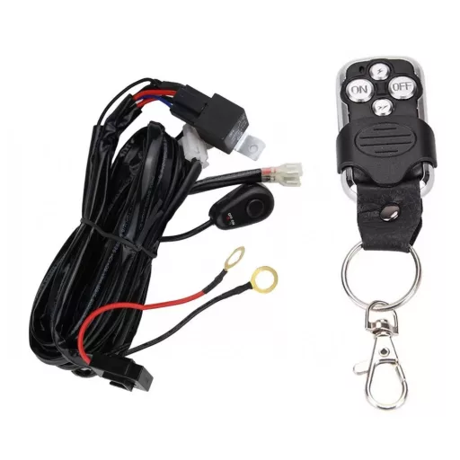 A komplett kábelköteg minden elemet tartalmaz a fényhíd / munkalámpa bekötéséhez, semmiféle kiegészítőre nincs szükség. Csak az akkumulátorhoz és a fényhídhoz kell csatlakoztatni. (biztosíték, relé, főkapcsoló, távirányító + vevő modul, kábelek)