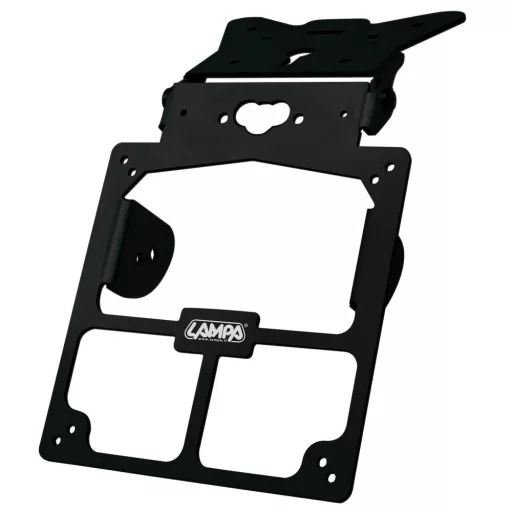 Állítható dőlésszögű rendszámtábla. Lyukak a saroklámpák és a rendszámtábla világítás rögzítéséhez.