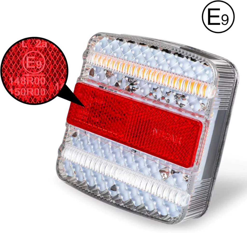 Ez a képen egy pár LED-es hátsó lámpa szett, amelyet tipikusan utánfutókhoz, lakókocsikhoz vagy kisebb teherjárművekhez használnak. Az „E jeles” megjelölés azt jelenti, hogy a termék megfelel az európai közúti előírásoknak (ECE jóváhagyással rendelkezik), így közúti használatra engedélyezett.