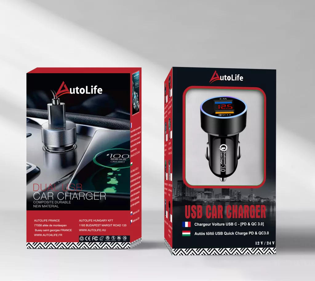 A töltő két USB-porttal rendelkezik, amelyek lehetővé teszik két eszköz egyidejű töltését.