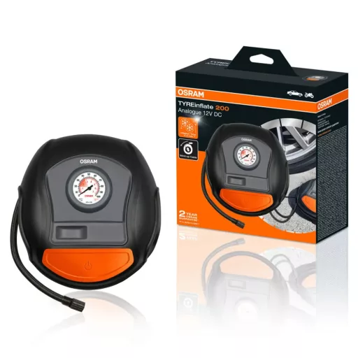 OSRAM Tyreinflate 200 analóg gumiabroncs pumpa egy 13” méretű lapos gumiabroncsot 4,5 perc alatt fúj fel teljesen**. A nagy ki-/bekapcsológomb egyszerűvé teszi a használatot. Stabil kialakítása révén a pumpa használat közben mozdulatlan marad. Egy fedélzeti 12 V-os aljzatra kötve a Tyreinflate 200 hosszú, 3 m-es hálózati kábele könnyebbé teszi az összes abroncs elérését a jármű körül. A nyomásértékeket kPa, BAR és PSI egységben jeleníti meg. Szelepsapka-tárolóval rendelkezik. Háromrészes adapterkészlet biztosítja, hogy kerékpárgumikhoz, labdákhoz vagy más felfújható eszközökhöz is használhassa.**13” méretű gumiabroncs teljes felpumpálása lapos állapotról 2,41 BAR nyomásra.