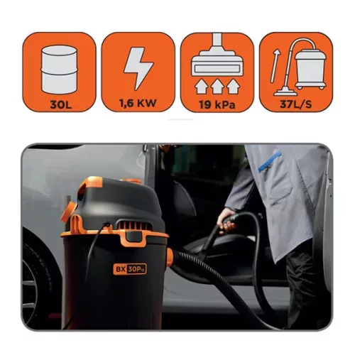 - MŰSZAKI ADATOK: Motor teljesítménye: 1600 W Vákuum: 19 kPa Légszállítás: 37 l/s Tartály űrtartalom: 30 l Súly: 7,4 kg