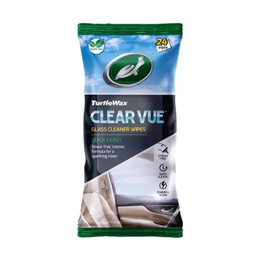 Turtle Wax CLEAR VUE üvegtisztító törlőkendők gyors és egyszerű csíkmentes tisztítást biztosítanak minden üveg- és tükrözött felületen. Az intenzív formula könnyedén kezeli az általános szennyeződéseket, az ujjnyomokat és a dohányfoltokat. Használható külső illetve belső üveg- és tükörfelületen , beleértve az oldalsó visszapillantó tükröt, a visszapillantó tükröt és a kamera lencséit is. Házartásban is tökéletes választás. A kendő műanyag mentes. Kiszerelés: 24db/csomag Újrazárható flow wrap csomag a nedvesség megőrzése érdekében.